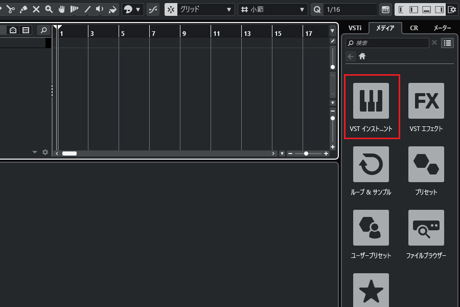 1ïŒç»é¢å³åŽã®ãŸãŒã³ã«ãããVSTã€ã³ã¹ãã¥ã«ã¡ã³ãããéžã³ãŸãã