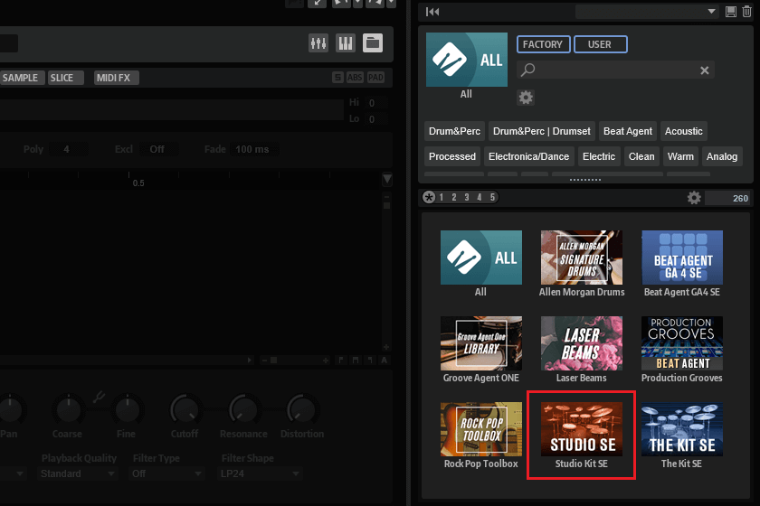 4ïŒãã©ã ãããäžèЧã衚瀺ããããããStudio Kit SEããéžæããŠããã©ã ããããèªã¿èŸŒã¿ãŸãã