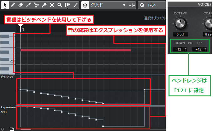 プリングの打ち蟌みでは、ピッチベンドず゚クスプレッションを掻甚したす。ピッチベンドで音皋を倉化させ、゚クスプレッションで音の匱たりを衚珟したす。