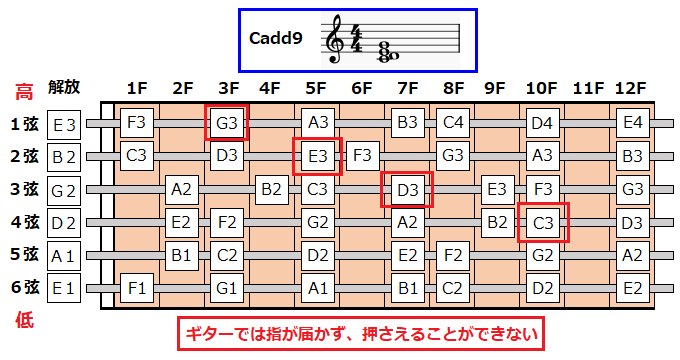 たずえば、Cadd9のコヌドはピアノなら無理なく匟けたすが、ギタヌでは指が届かず、挔奏が難しくなりたす。