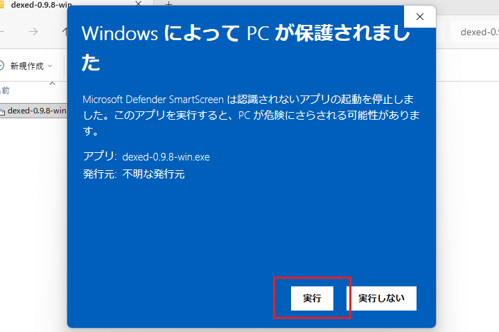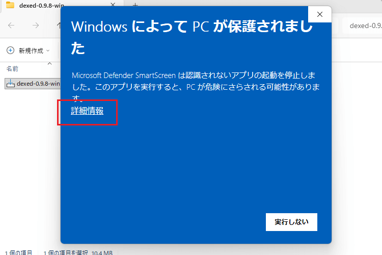 7.「dexed-0.9.8-winã€ã‚’èµ·å‹•ã™ã‚‹ã¨ã€æœªç½²åアプリã«è¡¨ç¤ºã•れる一般的ãªè¦å‘ŠãŒå‡ºã‚‹å ´åˆãŒã‚りã¾ã™ãŒã€å•題ã‚りã¾ã›ã‚“。表示ã•れãŸã‚‰ã€Œè©³ç´°æƒ…å ±ã€ã‚’クリックã—ã¾ã™ã€‚