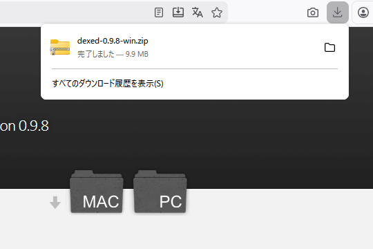 3.「dexed-0.9.8-win.zipã€ã®ãƒ€ã‚¦ãƒ³ãƒãƒ¼ãƒ‰ãŒå®Œäº†ã—ã¾ã—ãŸã€‚