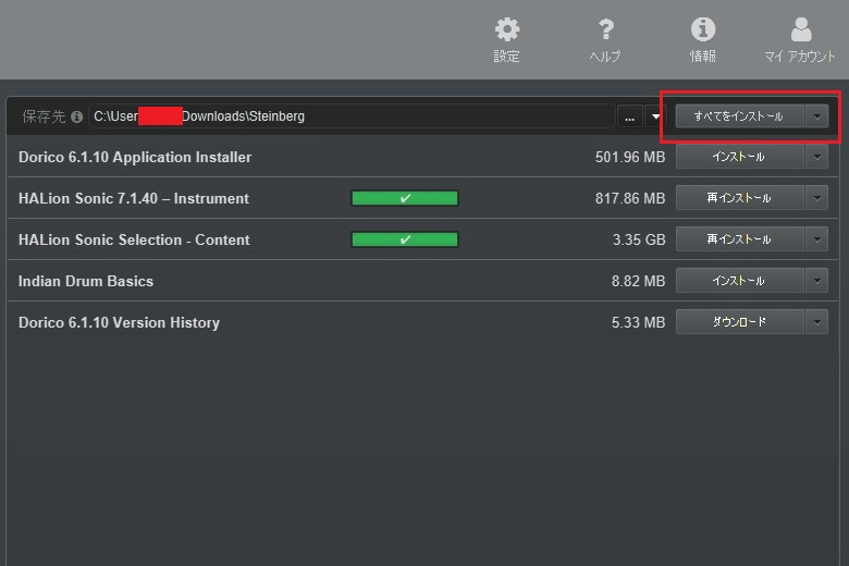 7.画é¢å³ä¸Šã®ã€Œã™ã¹ã¦ã‚’インストールã€ã‚’クリックã—ã¦ã€é–¢é€£ãƒ•ァイルを一括ã§ã‚¤ãƒ³ã‚¹ãƒˆãƒ¼ãƒ«ã—ã¾ã™ã€‚