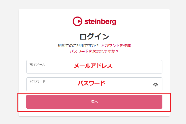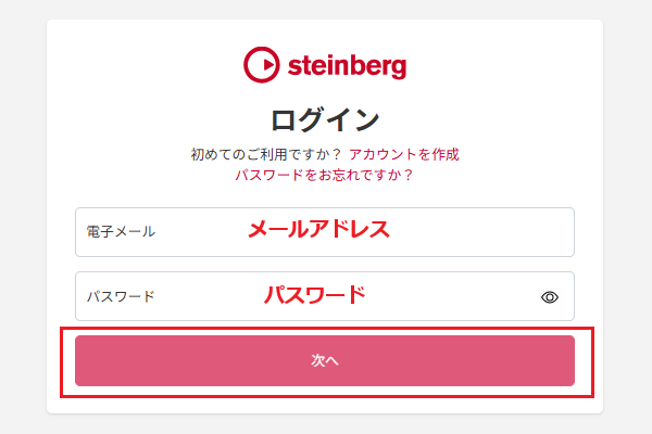3.メールアドレスã¨ãƒ‘スワードを入力ã—ã€ç”»é¢ä¸‹éƒ¨ã®ã€Œæ¬¡ã¸ã€ãƒœã‚¿ãƒ³ã‚’クリックã—ã¦ãã ã•ã„。