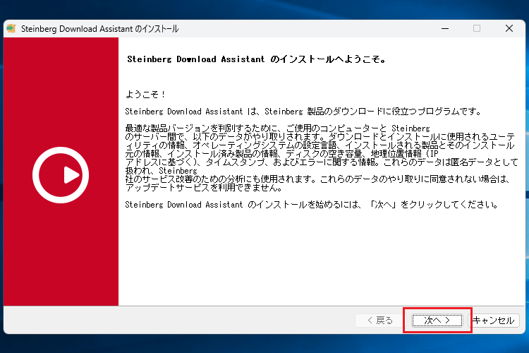 7.Steinberg Download Assistantã®ã‚¤ãƒ³ã‚¹ãƒˆãƒ¼ãƒ«ã‚’é–‹å§‹ã—ã¾ã™ã€‚「次ã¸ã€ã‚’クリックã—ã¦ãã ã•ã„。
