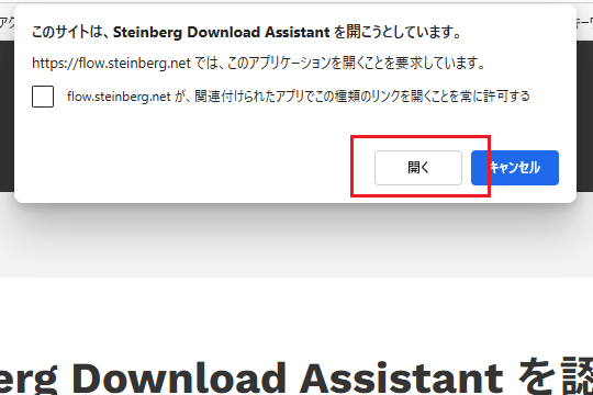 4.ブラウザã«ã‚¢ãƒ—リを開ãã‹ã©ã†ã‹ã®ç¢ºèªãƒ¡ãƒƒã‚»ãƒ¼ã‚¸ãŒè¡¨ç¤ºã•れãŸã‚‰ã€ã€Œé–‹ãã€ã‚’クリックã—ã¦ç¶šè¡Œã—ã¾ã™ã€‚