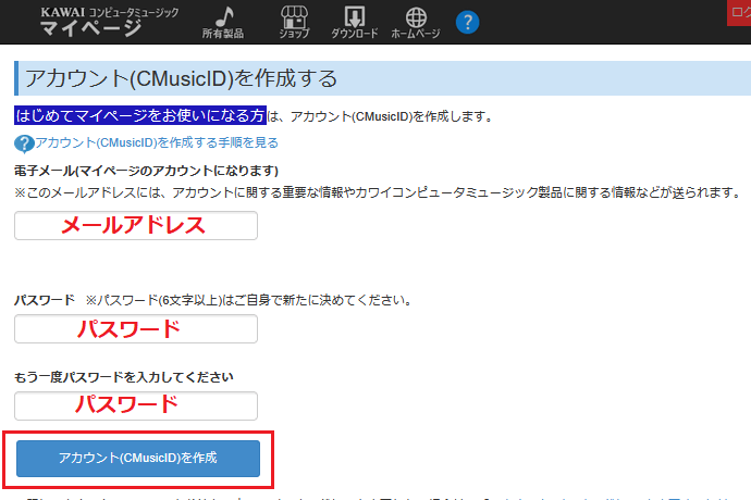 4シ弱Γ繝シ繝ォ繧「繝峨Ξ繧ケ縺ィ繝代せ繝ッ繝シ繝峨r蜈・蜉帙@縲√後い繧ォ繧ヲ繝ウ繝茨シCMusicIDシ峨r菴懈舌阪懊ち繝ウ繧呈款縺励∪縺吶
