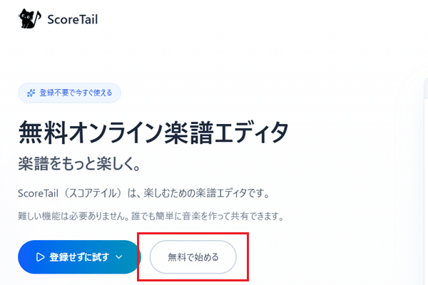 たずはScoreTailの公匏サむトぞアクセスし、「無料で始める」からアカりントを登録。登録方法はメヌルアドレスのほかGoogleアカりントも遞べたので、今回は手軜な埌者で枈たせた。