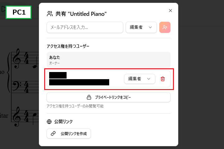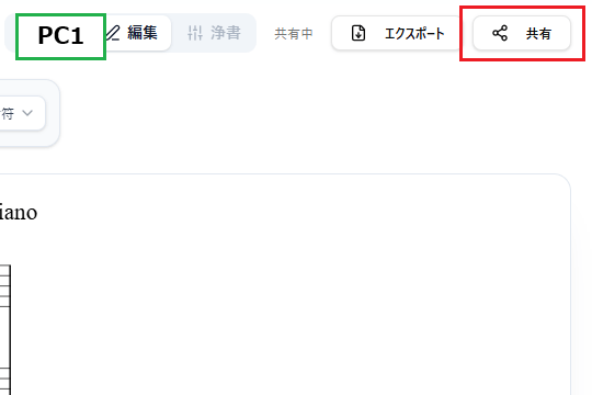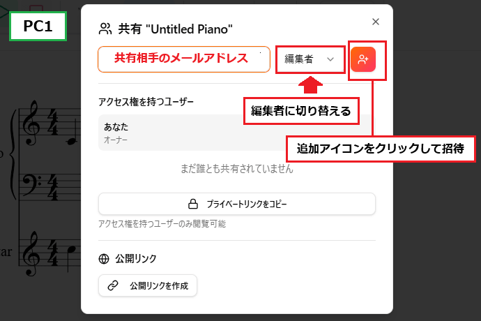 たずはメむンアカりントPC1で楜譜を開き、共有ボタンからサブアカりントPC2を招埅しおみる。