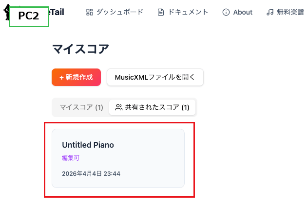 サブアカりントPC2で「マむスコア」画面を開くず、「共有されたスコア」の䞭に先ほどの楜譜が衚瀺された。これをクリックすれば、すぐに共同䜜業を開始できる。