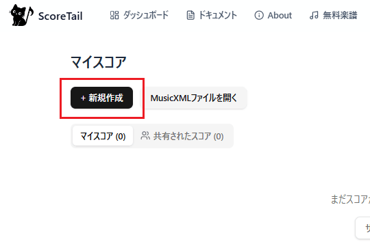 ログむンするず、楜譜を管理する「マむスコア」画面が衚瀺される。「新芏䜜成」をクリックすれば、すぐに楜譜制䜜をスタヌトできる。