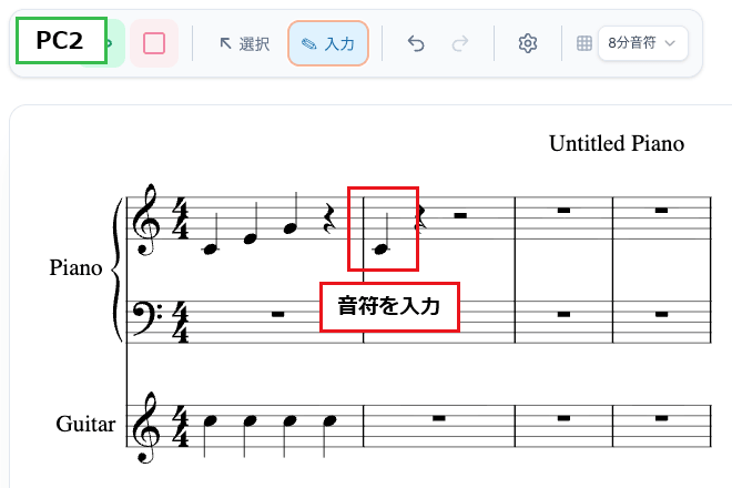 䞀瞬ずたではいかないものの、わずかな時間差でメむンアカりントPC1の楜譜にも、しっかりず音笊が衚瀺された。これなら共同䜜業でも十分に掻甚できそうだ。