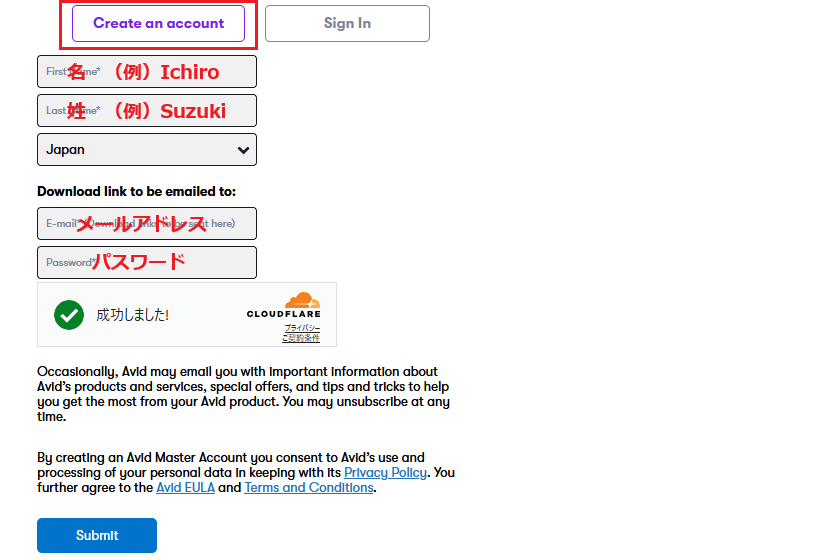4ïŒAVIDã¢ã«ãŠã³ãããæã¡ã§ãªãå Žåã¯ãCreate an accountããã¯ãªãã¯ããæ°åãã¡ãŒã«ã¢ãã¬ã¹ãªã©å¿