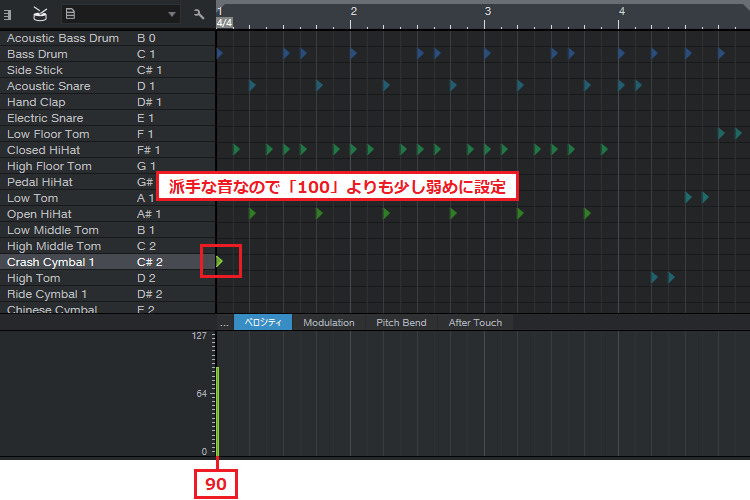 35ïŒãã©ã ãšãã£ã¿ãŒã«ãã©ã ããããé©çšããã¯ã©ãã·ã¥ã·ã³ãã«ã®MIDIããŒããæã¡èŸŒã¿ãŸããäžå³ã®ããã«ãCrash Cymbal1ïŒC#2ïŒããå