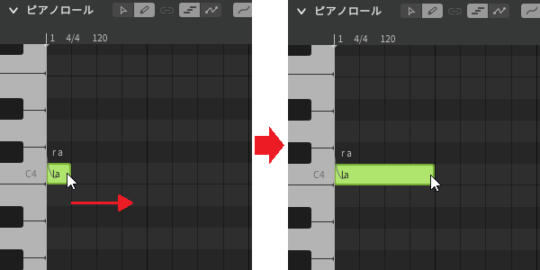 é·ãã倿ŽãããMIDIããŒããéžæãããããéžæããããŒãã®ç«¯ãå·Šå³ã«ãã©ãã°ããŠé·ãã倿ŽããŸãããã