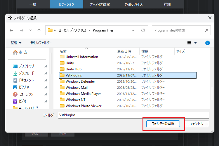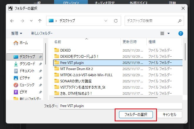 4シ惹ク隕ァ縺九i縲熊ree VST plugin縲阪ヵ繧ゥ繝ォ繝繝シ繧帝∈縺ウ縲√後ヵ繧ゥ繝ォ繝繝シ縺ョ驕ク謚槭阪r繧ッ繝ェ繝繧ッ縺励∪縺吶