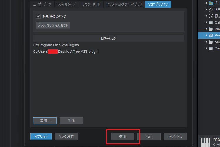 6シ弱熊ree VST plugin縲阪ヵ繧ゥ繝ォ繝繝シ縺瑚ソス蜉縺輔l縺溘i縲√碁←逕ィ縲阪懊ち繝ウ繧偵け繝ェ繝繧ッ縺励※險ュ螳壹r蜿肴丐縺輔○縺セ縺吶