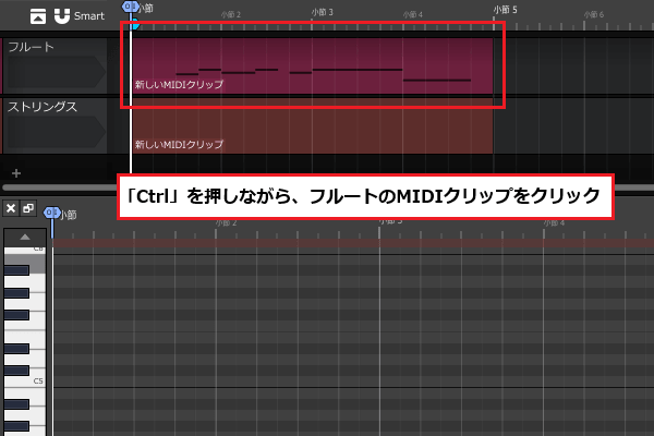 6ïŒã¹ããªã³ã°ã¹ã®MIDIãšãã£ã¿ãŒãéãããŸãŸããCtrlãããŒãæŒããªãããã«ãŒãã®MIDIã¯ãªãããã¯ãªãã¯ããŸãã