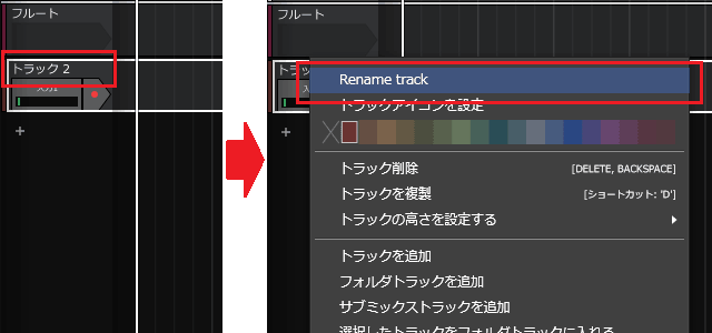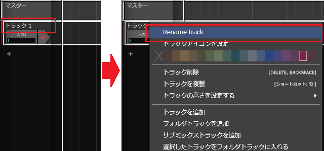 3ïŒè¿œå ããããã©ãã¯ã«ååãä»ããŸããããã©ã㯠1ããå³ã¯ãªãã¯ããŠããRename trackããéžæããŸãã